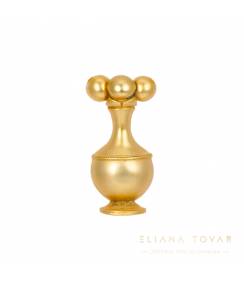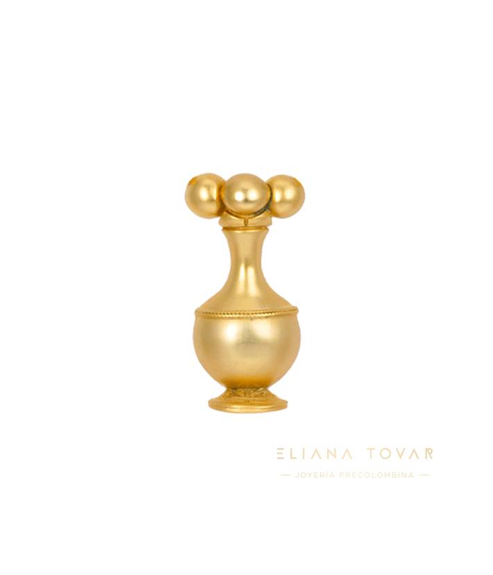 El dije pequeÏo poporo Quimbaya, representa un recipiente ceremonial para el mambeo de hojas de coca durante las ceremonias religiosas, la mezcla de los alcaloides junto con la cal y la hoja de coca, se utilizaban para ritos ceremoniales a sus divinidades. Esta joya tallada en filigrana tiene un baÏo de 24K.